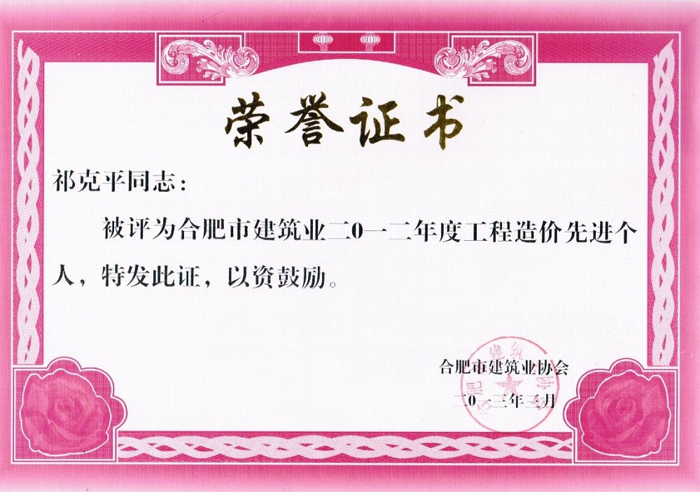 2012年度优秀造价人员--二级造价师祁克平